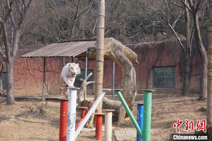无锡动物园内,一只白虎走上梅花桩。 孙权 摄