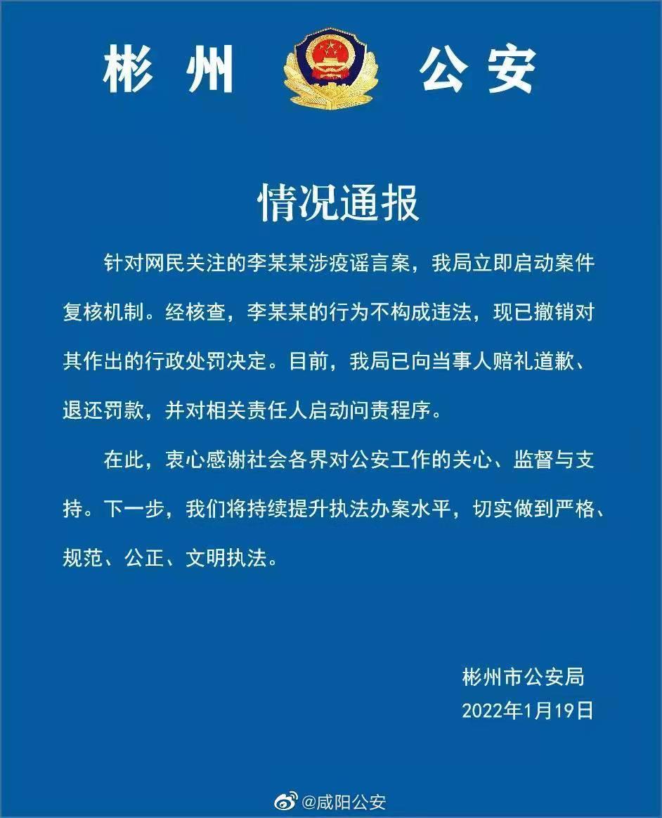 1月19日晚,陕西咸阳彬州市警方发布情况通报,针对网民关注的李某某涉疫谣言案,彬州警方立即启动案件复核机制。经核查,李某某的行为不构成违法,现已撤销对其作出的行政处罚决定。目前,彬州市公安局已向当事人赔礼道歉、退还罚款,并对相关责任人启动问责程序。