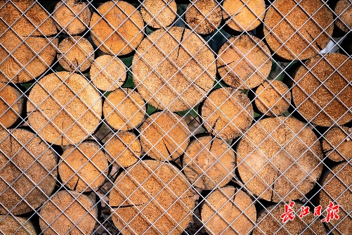 九女墩景区用一段段木头做成的围墙。 记者任勇 摄