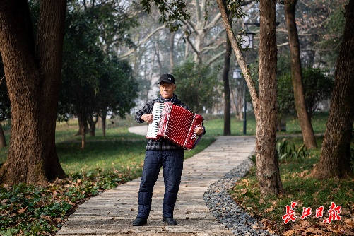 一名市民在新铺的石板路上沉醉在手风琴的乐声中。 记者任勇 摄