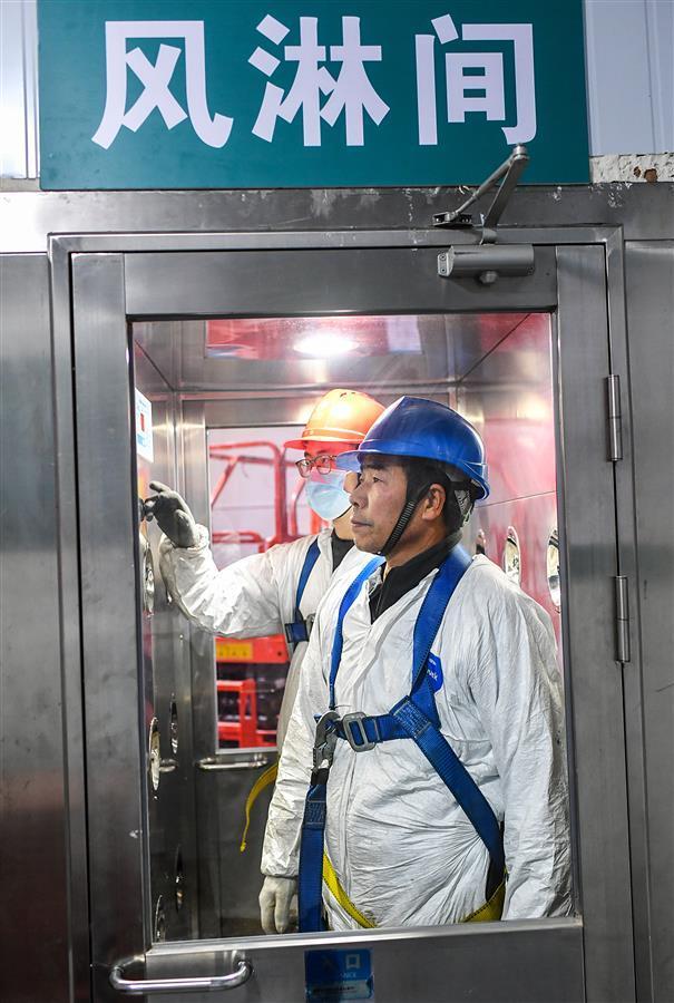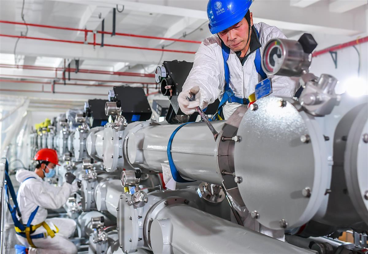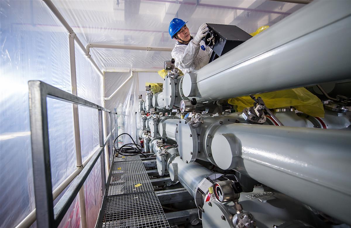 1月20日,在徐东220千伏变电站的负二层里,220千伏GIS(变电站主体设备)、110千伏GIS主体安装完成,工人穿着防尘服在做最后的检查。