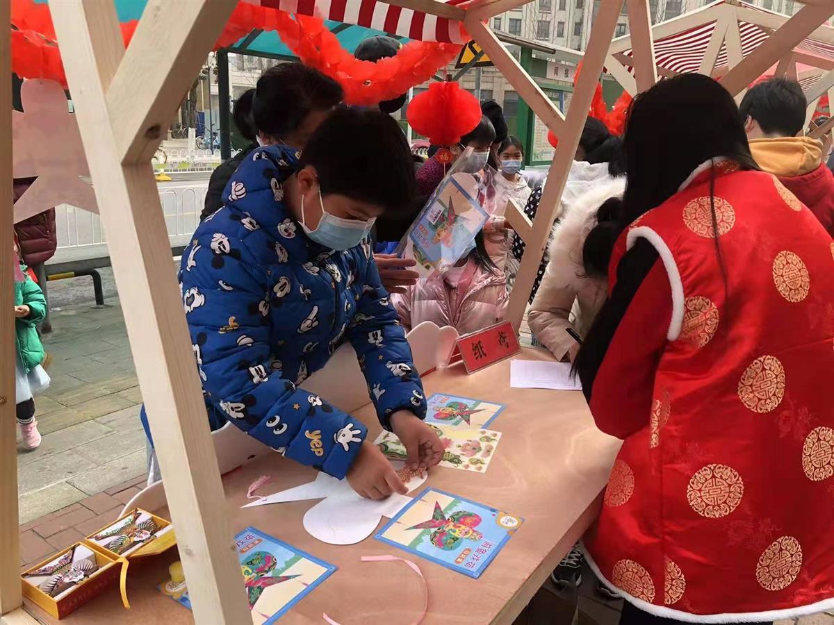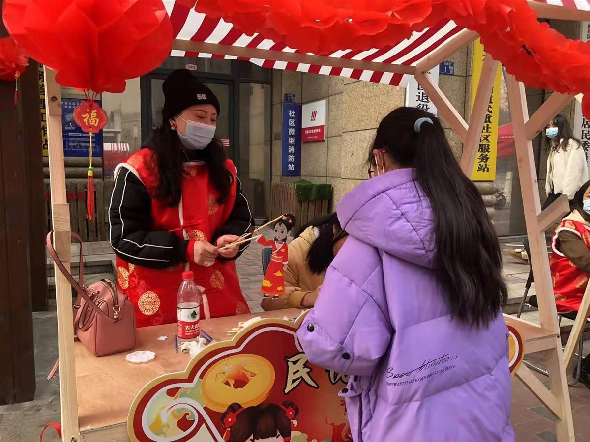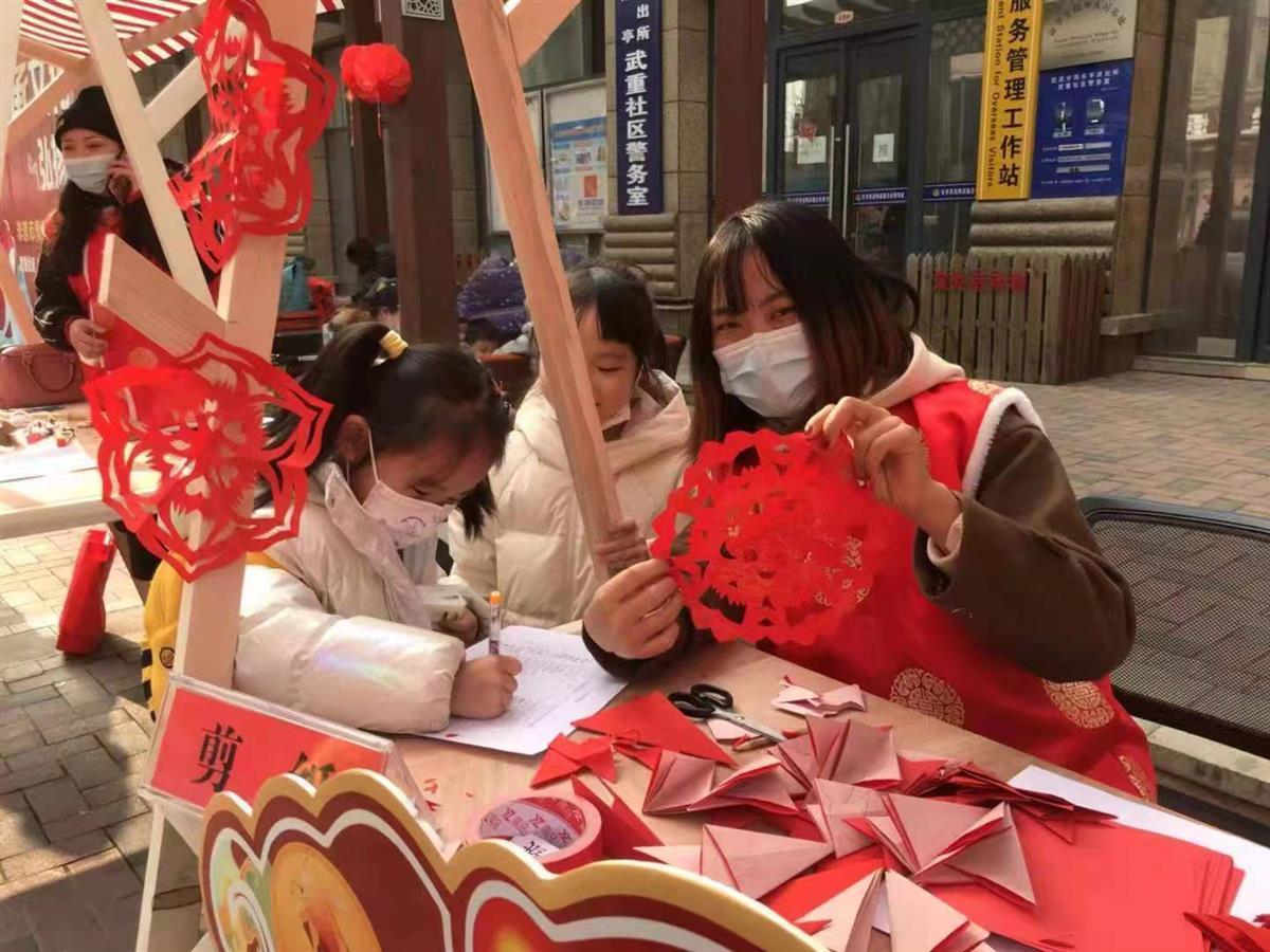 当天下午,武重社区居委会门口张灯结彩,人潮涌动。写春联、剪窗花、皮影制作、糖画、糖葫芦、画纸鸢、套圈等摊位,吸引了越来越多的居民。大家自主选择想要体验的非遗项目,让原本显得“高冷”的“非遗文化”更接地气。