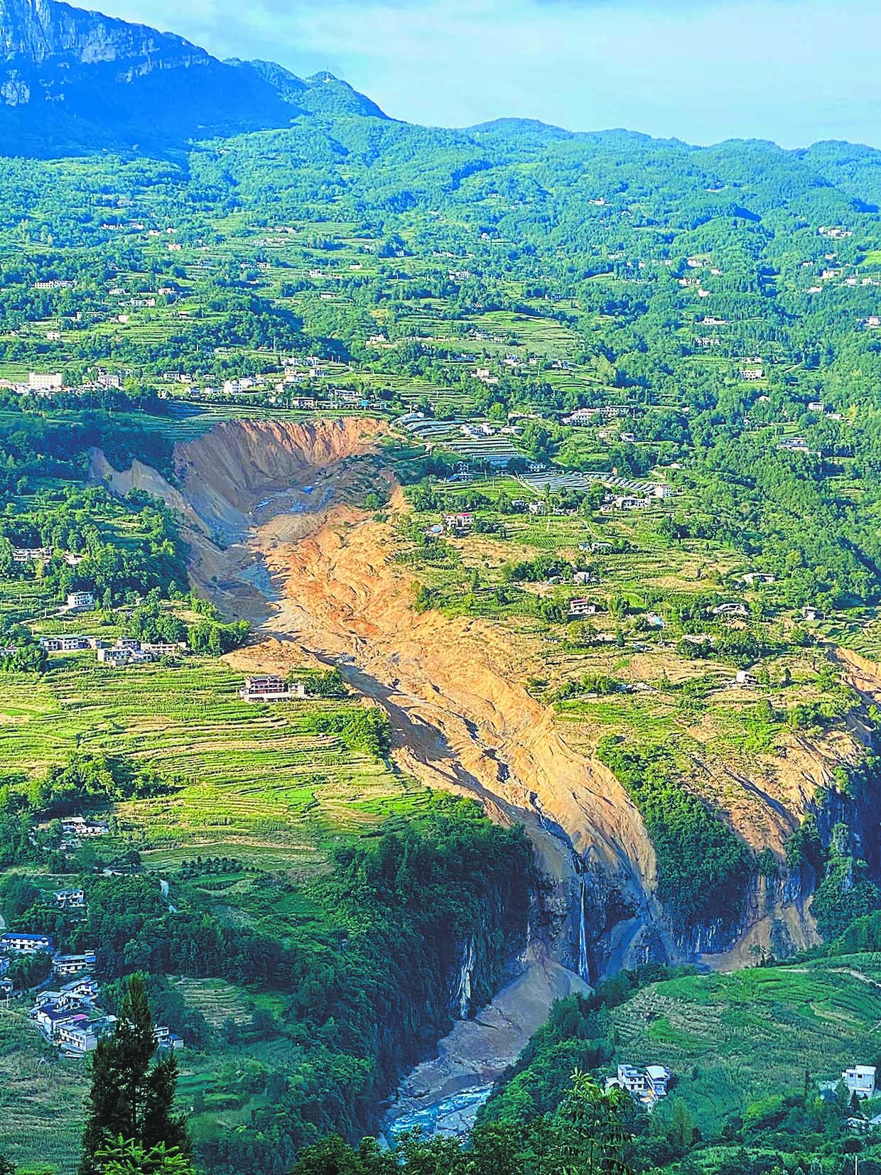 2020年8月6日,笔者在滑坡体对面的318国道观景平台拍摄马者村沙子坝全貌,绿意盎然的山间,一道黄色“伤痕”格外显眼。