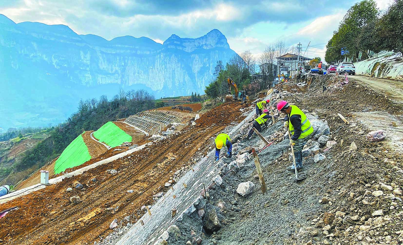 滑坡治理现场,工人正在进行挡土墙护坡施工作业。