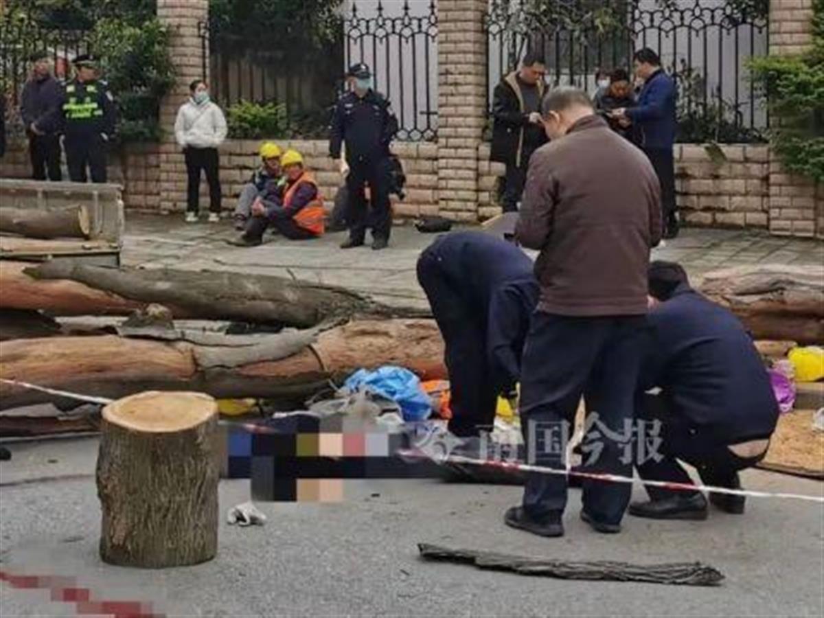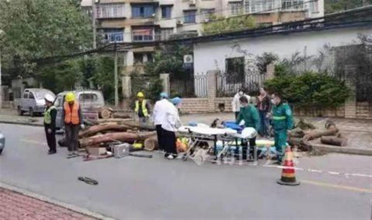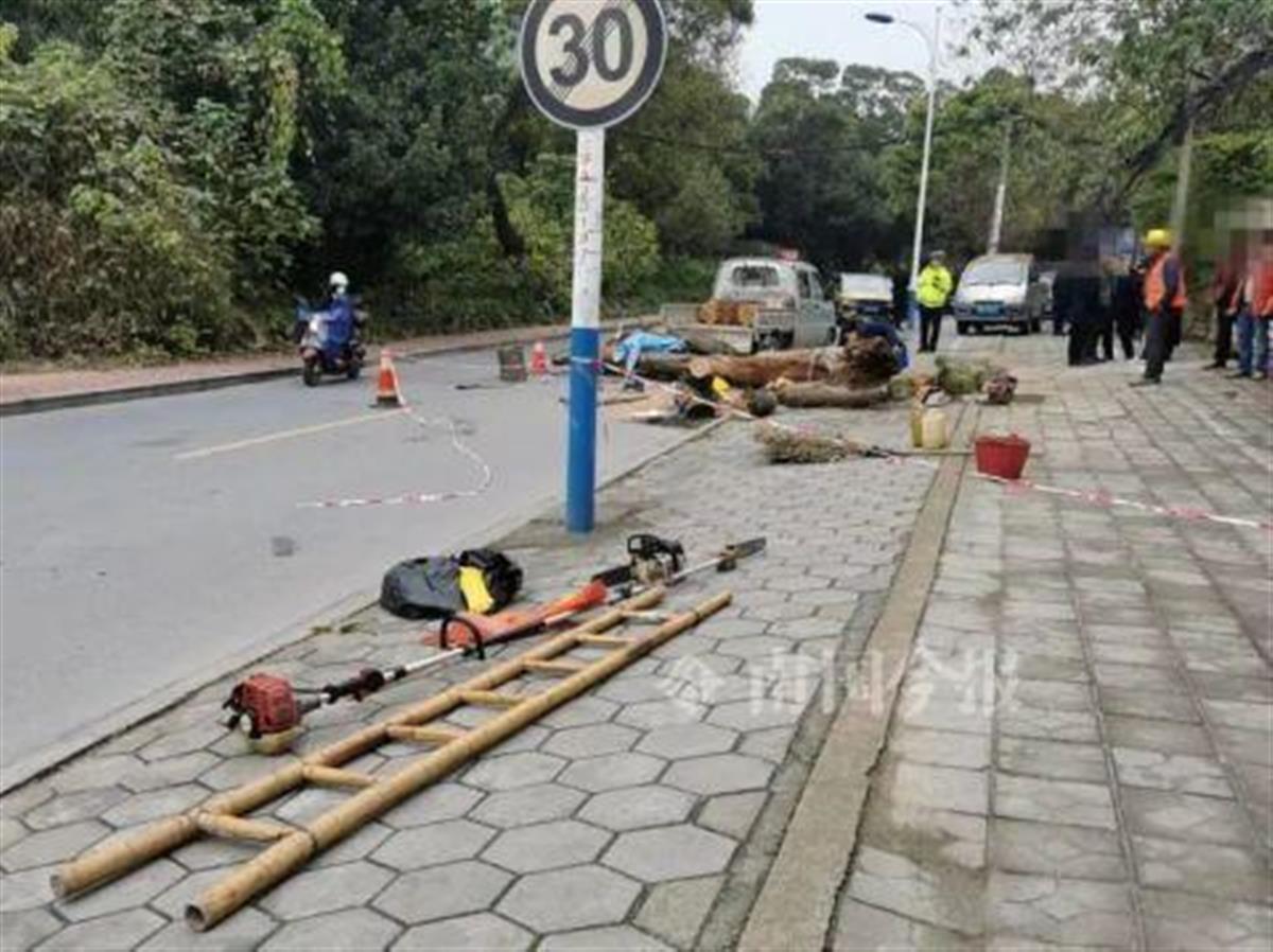 社湾路附近一名商户告诉记者,事发20日上午9时许,工人在处理道旁树木的时候发生了意外。现场视频显示,一棵枯树倒伏在地,有身穿施工服装的人员躺在路面上。事故发生后,公安部门和医护人员到场进行救援。