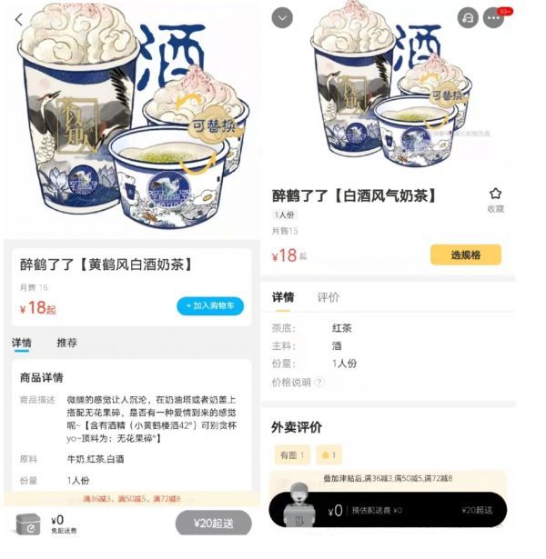记者点击产品页面,其中茶以知人旗下一款“醉鹤了了”(黄鹤风白酒奶茶),在饿了么平台上的商品描述为含有42°的小黄鹤楼酒,在美团上则没有任何的酒精浓度描述和禁止饮用人群的风险提示。而许多品牌长期在售的“酒酿”饮品,也仅在描述中写出了酒、米酒的字样,对于酒精浓度和不宜饮用人群则只字未提。