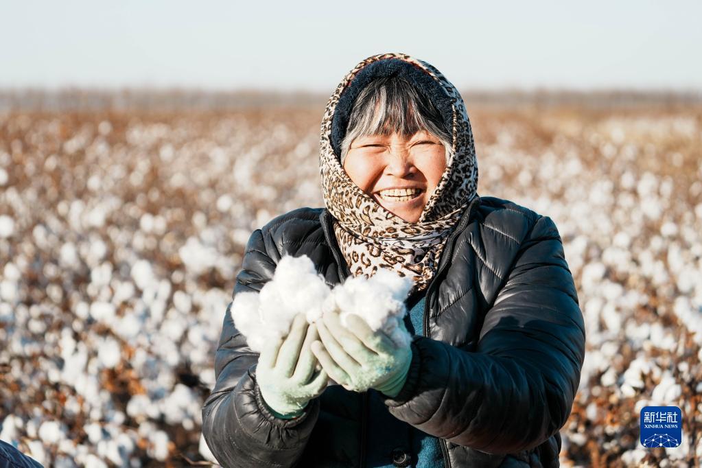 山东省无棣县景国农机服务专业合作社棉农张元梅在棉田里采摘棉花(2021年12月1日摄)。新华社记者 朱峥 摄
