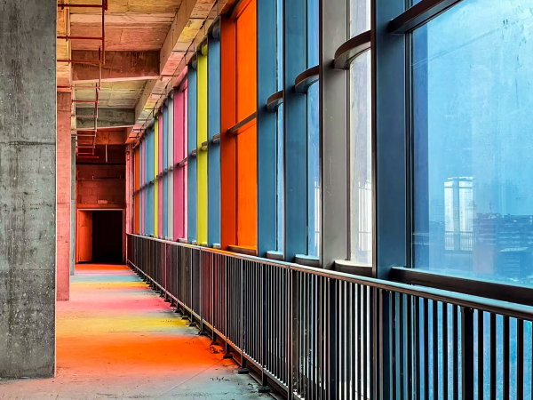 步行到四层,立马可见到彩色玻璃幕墙的区域,与室外的观感不同,站在室内,光线透过玻璃穿进来,形成一道天然的彩虹走道,让人忍不住顺手拍下这一奇妙的场景。