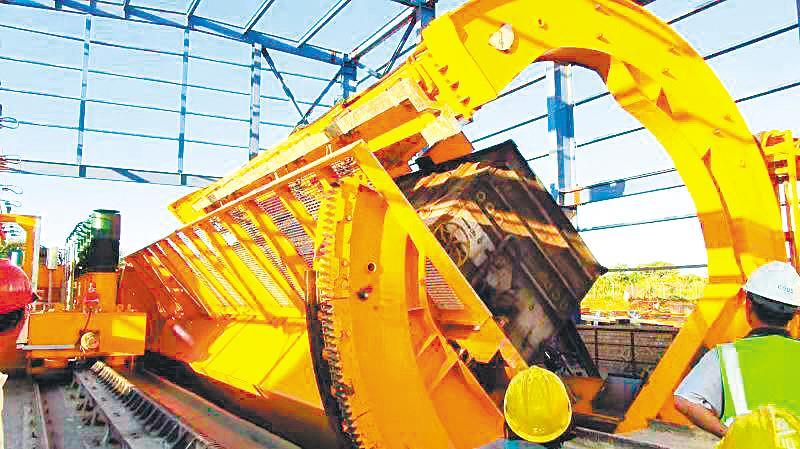 别看它块头大,可动作却不笨拙。一列5000吨的铁路敞车,人工或小型挖机卸料需要用上几天时间,而翻车机仅用2小时即可卸完。单台翻车机每小时能翻卸20至30节铁路敞车。