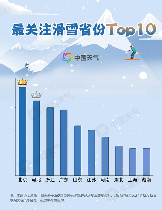 统计近一个月搜索滑雪的网友,按地域分布,可以看出冬奥会举办地对冰雪运动热情高涨,北京、河北分别占据了排行榜冠亚军位置。浙江、广东紧随其后位列三四位。在10个滑雪高关注度省份中,南方省份超过一半,可见南方人民对冰雪的向往。