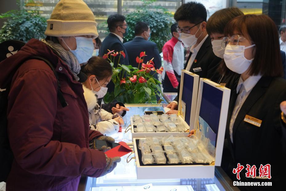 1月22日,北京2022年冬奥会特许商品冰雪竞技金条、冰雪竞技银条套装发布会在北京举行。图为民众在现场咨询冰雪竞技银条套装。 中新社记者 崔楠 摄