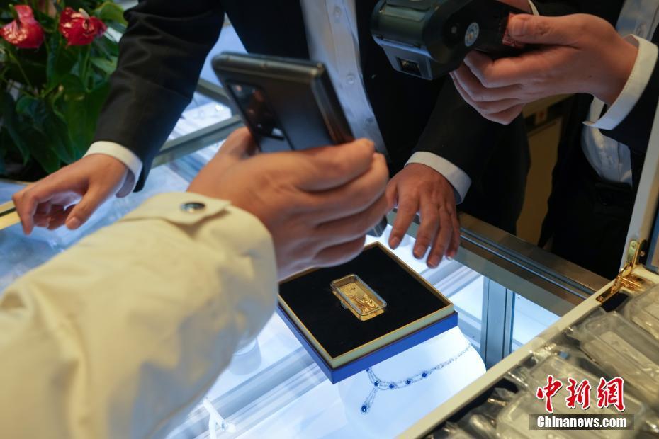1月22日,北京2022年冬奥会特许商品冰雪竞技金条、冰雪竞技银条套装发布会在北京举行。图为顾客在现场扫码购买冰雪竞技金条。 中新社记者 崔楠 摄