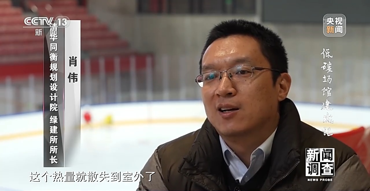 清华同衡规划设计院绿建所所长 肖伟:对于我们这个体育建筑而言,我们不可能像住宅全部都是采用实心墙体,因为我们整个要打造一个比较通透的空间,我们这个项目就必须要采用这种玻璃幕墙,我们整个项目的玻璃幕墙超过了一万平方米,这一万平方米就是我们这个房子损失热量非常重要的一个途径。
