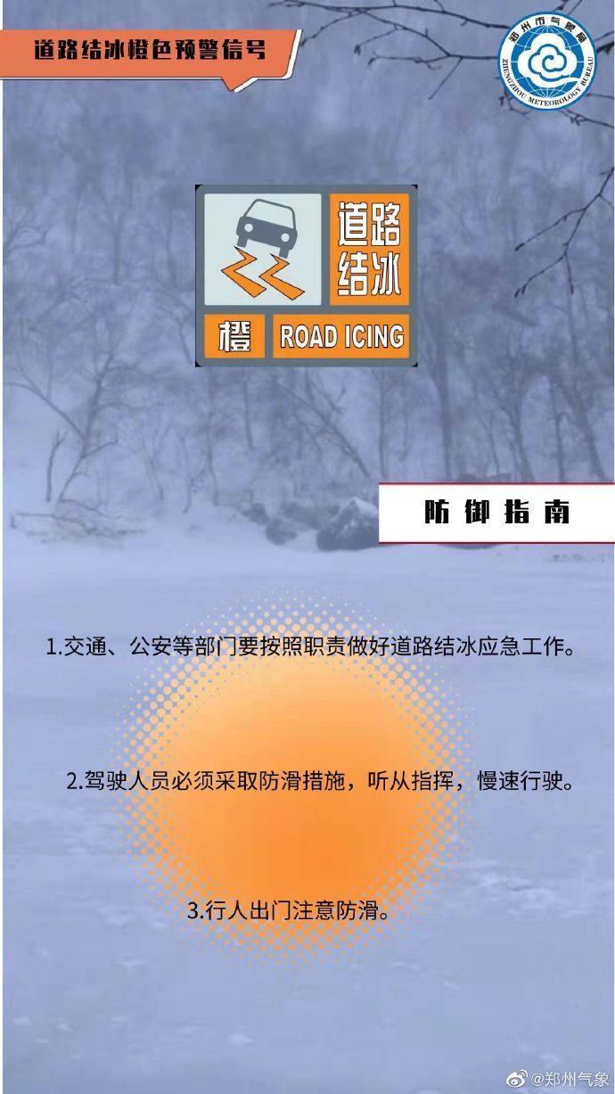 根据郑州市气象台预报,1月23日夜,郑州阴天有中到大雪。23日6时10分郑州市气象台继续发布道路结冰橙色预警信号: