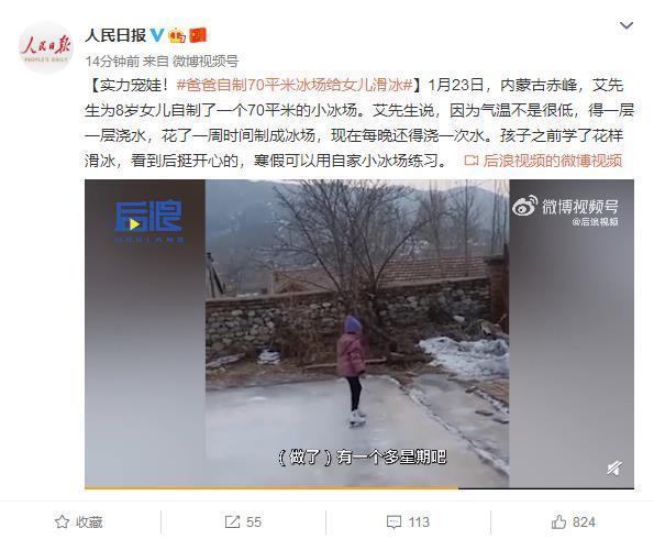 1月23日,内蒙古赤峰,艾先生为8岁女儿自制了一个70平米的小冰场。艾先生说,因为气温不是很低,得一层一层浇水,花了一周时间制成冰场,现在每晚还得浇一次水。孩子之前学了花样滑冰,看到后挺开心的,寒假可以用自家小冰场练习。