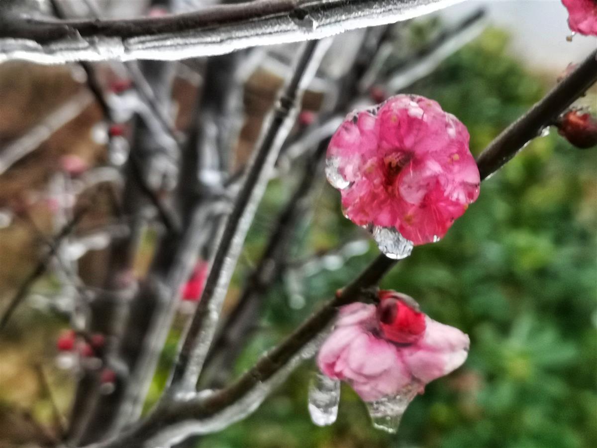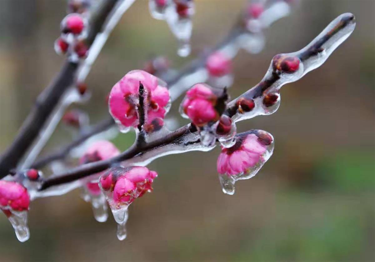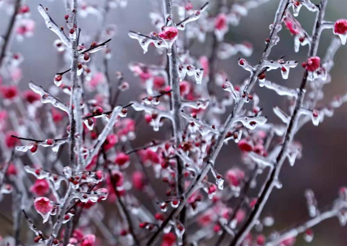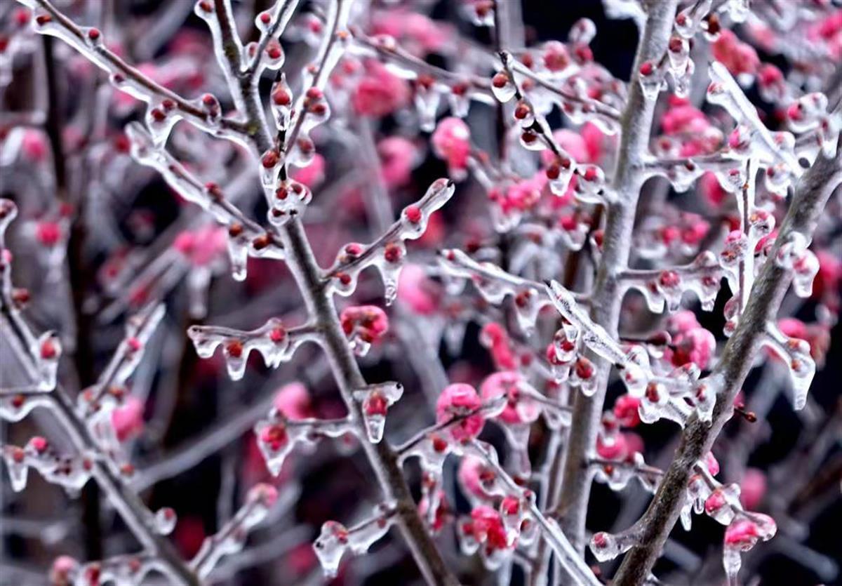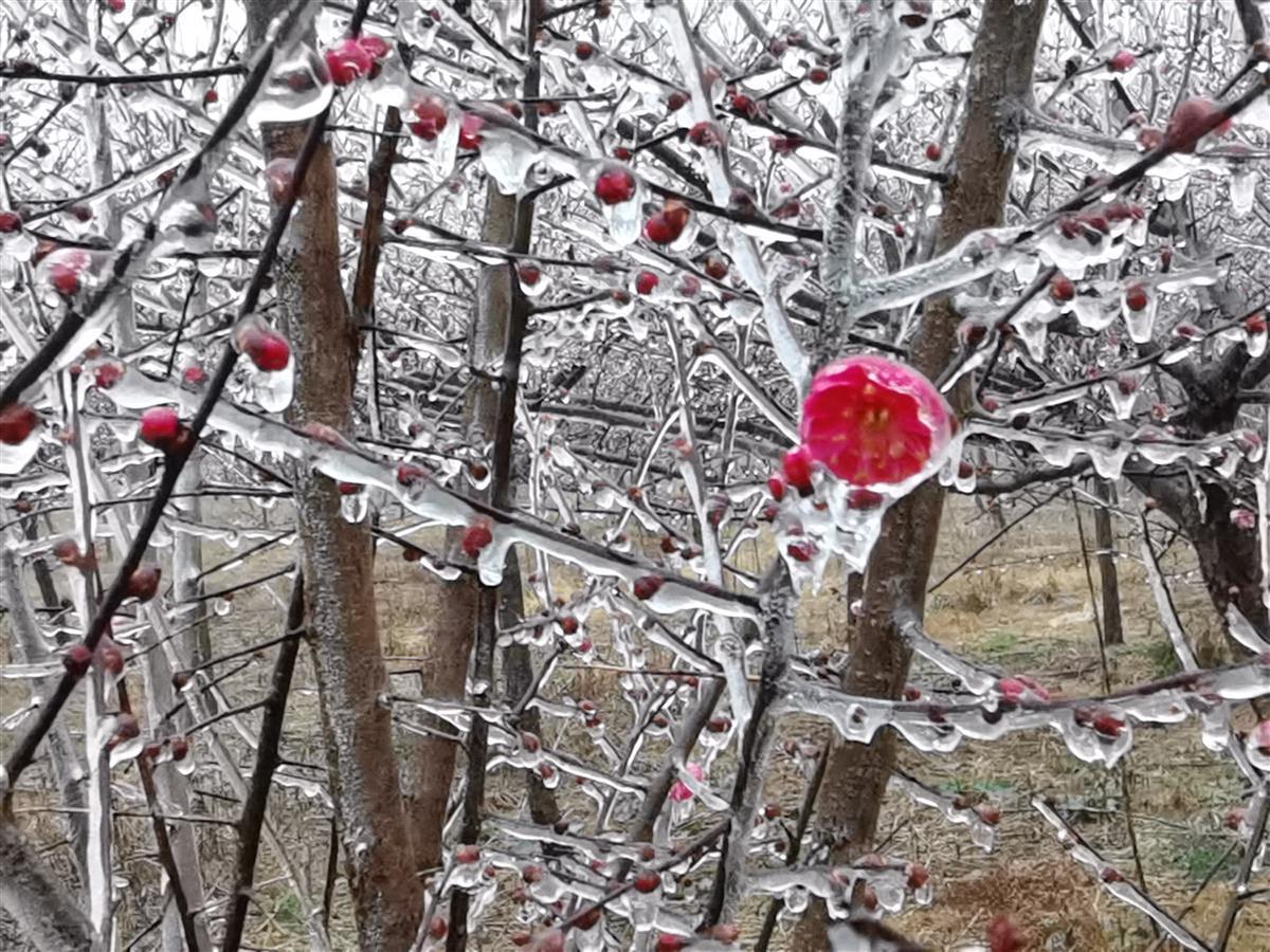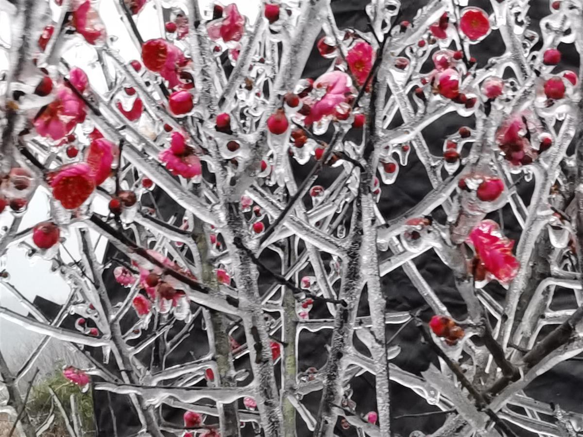 湖北日报讯 (通讯员钟国庆)1月22日,钟祥市东方阳春苗木园艺场,晶莹剔透的冰挂包裹着的梅花格外美丽。据苗木园艺场负责人介绍,受持续低温雨雪冰冻天气影响,近几天形成了这一奇景。