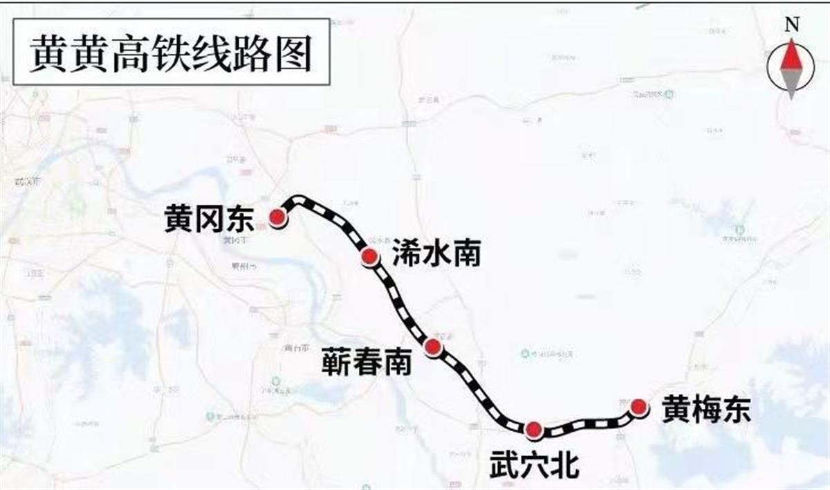 黄黄高铁位于湖北省东北部黄冈市境内,线路从武汉至黄冈城际铁路引出,向东南经浠水县、蕲春县、武穴市,黄梅县,于黄梅东站接入安九铁路。沿途设黄冈东站、浠水南站、蕲春南站、武穴北站、黄梅东站共5座车站,其中浠水南站、蕲春南站、武穴北站为新建车站。黄黄高速铁路正线全长126.85公里,设计时速350公里。