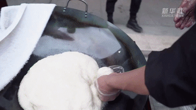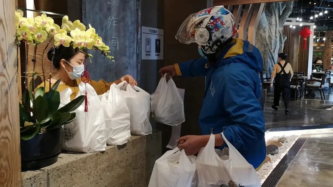 2021年2月17日,外卖配送员在成都一家火锅店交接消费者在线上下单的外卖火锅(手机照片)。新华社记者 胡旭 摄