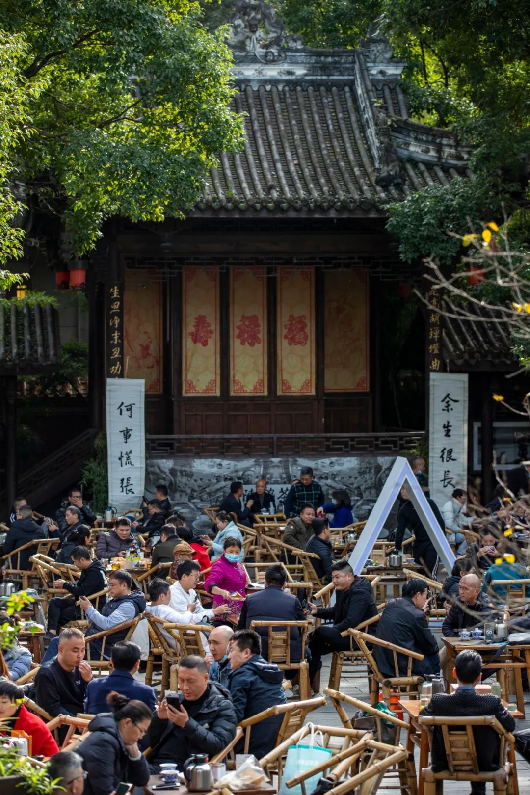 2021年11月23日,成都市陈锦茶铺前坐满了前来晒太阳喝茶休闲的人。新华社记者 沈伯韩 摄