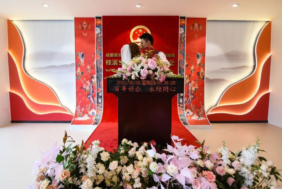2021年5月20日,在成都高新区桂溪生态公园婚姻登记处,一对新人在登记大厅里合影留念。当日,成都高新区桂溪生态公园婚姻登记处正式开放。新华社记者 王曦 摄