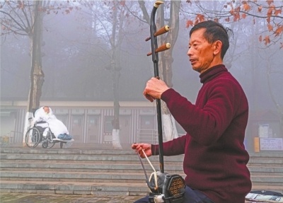 1月20日,背着二胡的老黎像往常一样用轮椅推着成明来到东湖。几曲唱罢,老黎开始拉二胡,吱吱呀呀刚刚开始,“啪”的一声,声音戛然而止,二胡的弦又断了,他只好掏出包里的备用弦换上再继续拉。这把一位护工送给老黎的二胡,老黎已用了16年,也给成明拉了16年,装二胡的背包已磨破了几个洞。