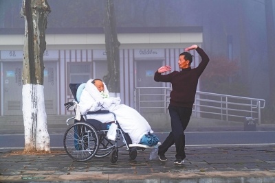 早上8时许,东湖之滨,一位轮椅上的老人被宽厚的棉被包裹着,一旁的老黎拿出音箱、握住话筒为老人演唱他新学的歌曲《梦中的蝴蝶》。几曲唱罢,老黎走向轮椅一边为老人擦拭口水,一边和他商量:“咱们今天再跳支舞?”