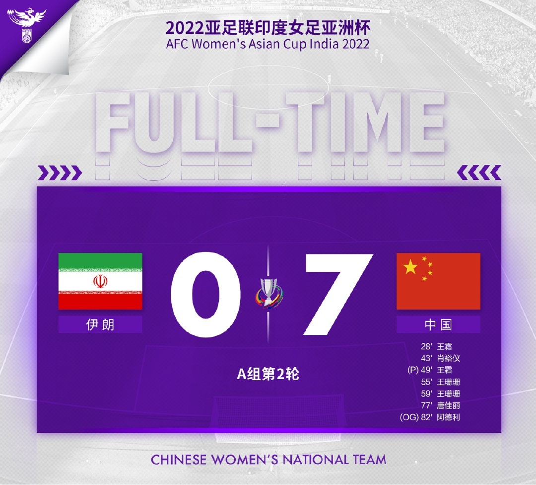 2022女足亚洲杯-中国女足7:0大胜伊朗女足。图片来源:中国女足官微