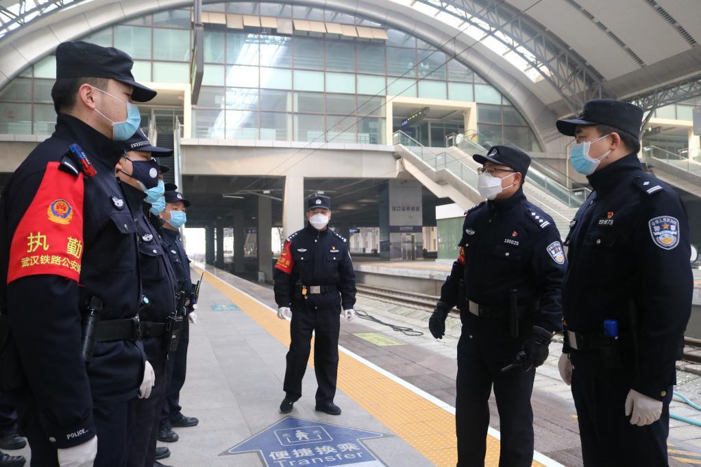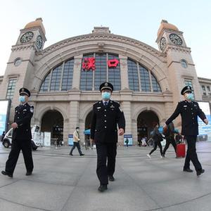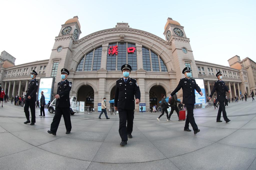张顺峰(中)和同事们在汉口站前(受访者供图)