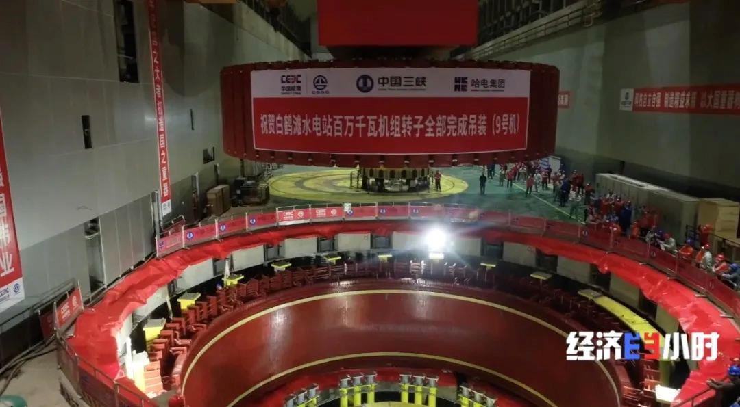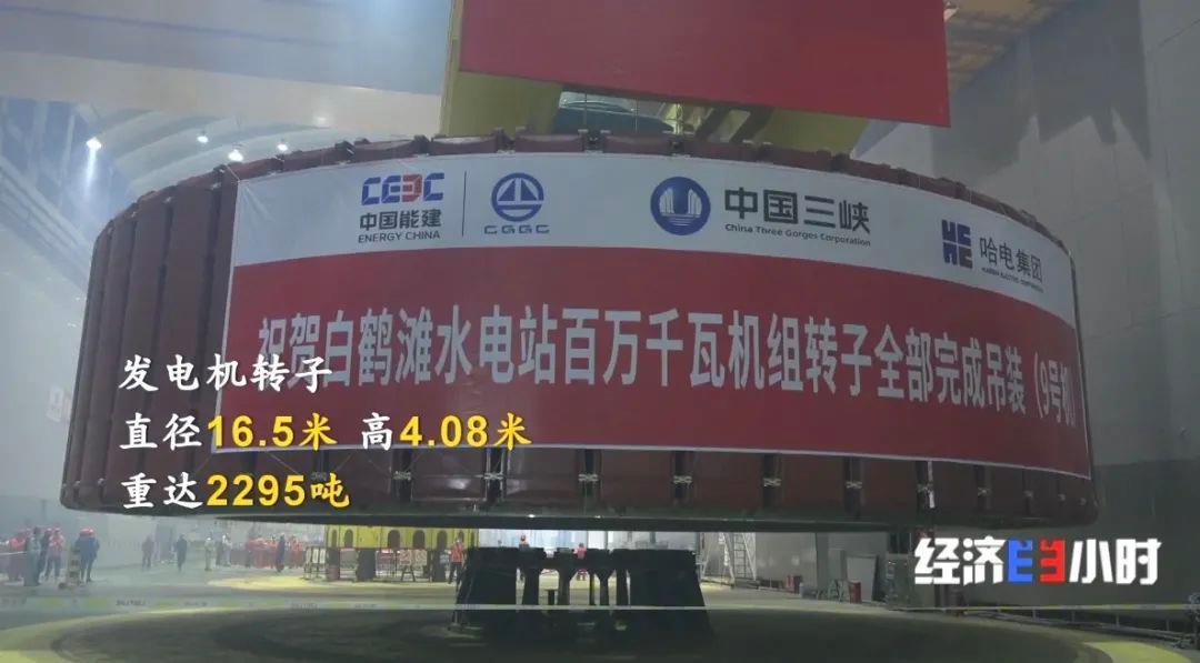 这个直径16.5米、高4.08米的巨无霸就是发电机的转子,重达2295吨,是整个机组安装过程中吊装重量最大的核心部件。随着转子平稳入坑,意味着白鹤滩水电站全部机组投产进入倒计时。