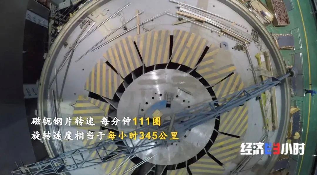转子是发电机组最重、最大的核心部件,2万多片扇形磁轭钢片重达1274吨,叠装在一起,将近4米高。这个庞然大物运转时,磁轭钢片的转速将达到每分钟111圈,相当于以每小时345公里的速度飞速旋转。现在,山西太原钢铁集团已经掌握了加工磁轭钢片的关键技术。