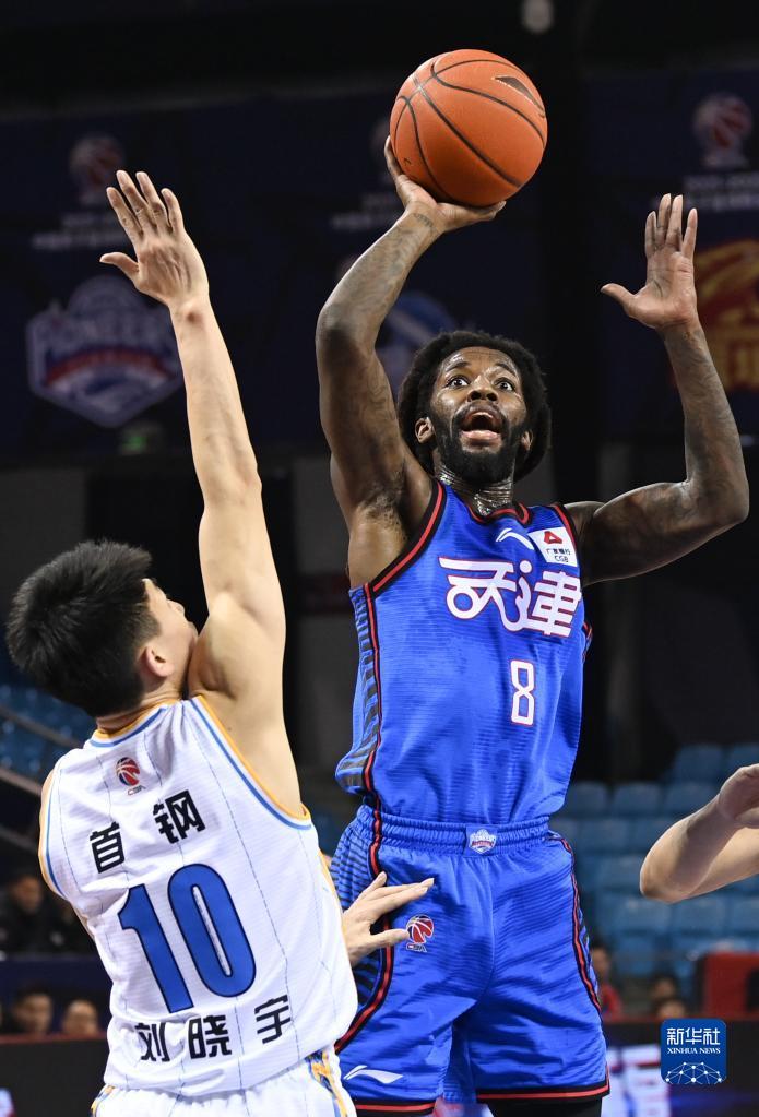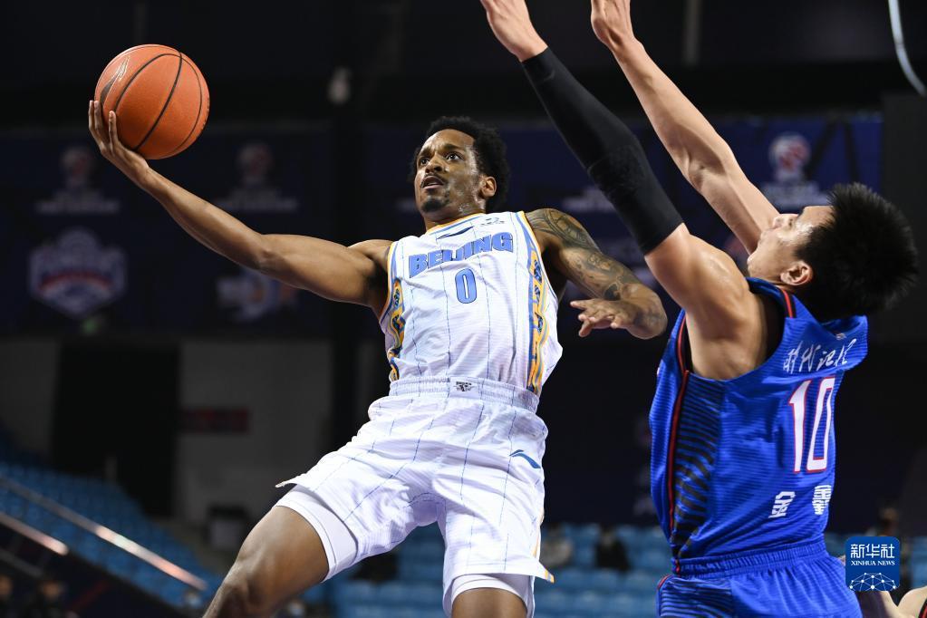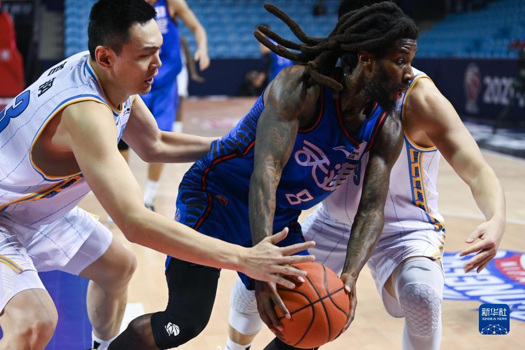 1月25日,天津先行者队球员伯顿(右)在北京首钢队球员刘晓宇的防守下进攻。