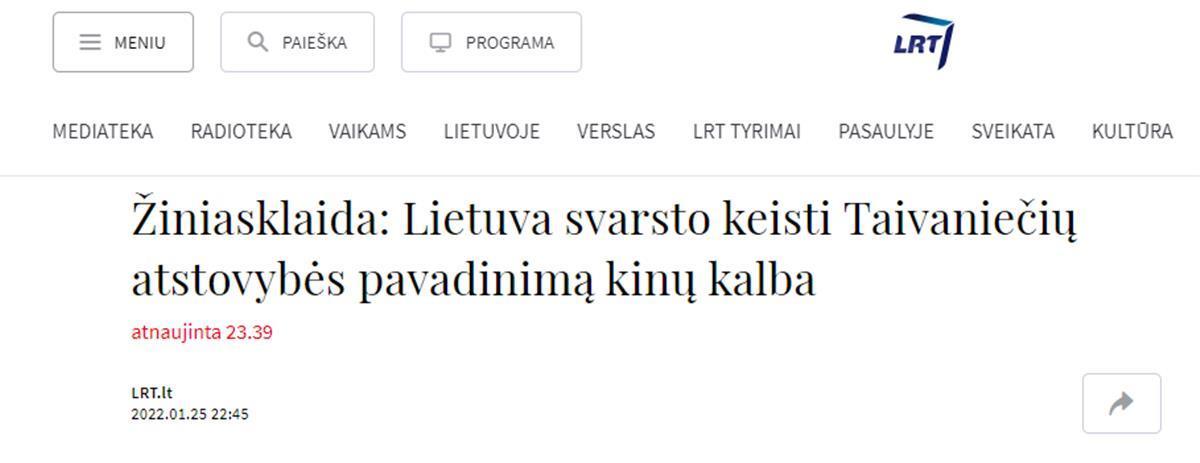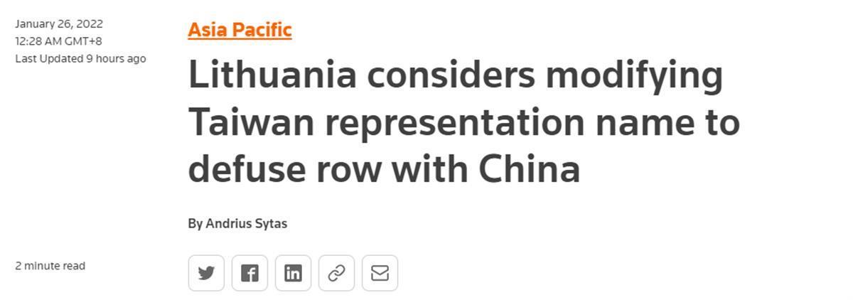 1月25日,立陶宛国家广播电视台(LRT)援引路透社的报道称,立陶宛政府正在考虑要求台湾更改“驻立陶宛台湾代表处”的名称,改为“台湾人代表处”,以化解与中国大陆的外交冲突,缓和双方紧张关系。