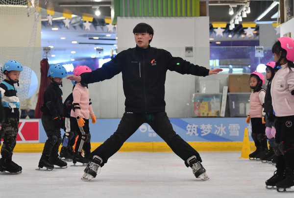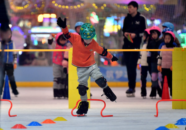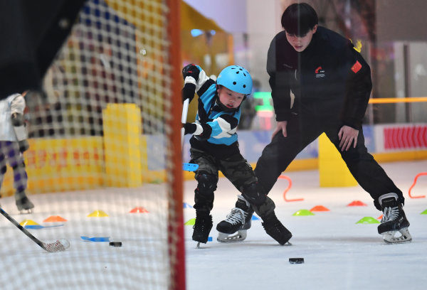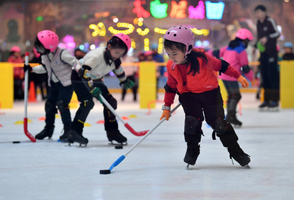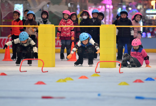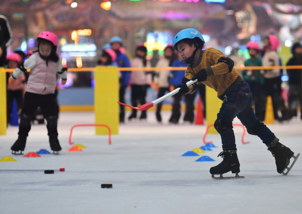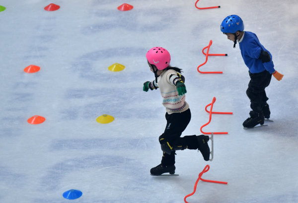 1月26日下午,在硚口荟聚非凡冰上文化中心,参加2022武汉市体育冬令营的孩子们正在冰上进行技能培训。分成4个班的180名小学员们,在经过7天的免费培训后,已经不再是扶着墙蹒跚学步的菜鸟,如今的他们已经可以组队进行障碍接力赛了。钻横梁、跨障碍,拿起球杆击球入网,看上去已经入门了。