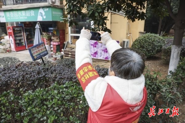 滨湖社区平安合伙人谢洪正在对巡查时发现的问题用手机拍照。记者胡冬冬 摄