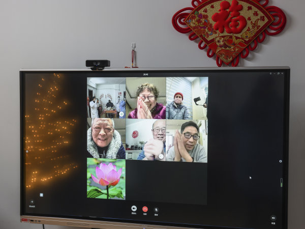 食堂将六道菜热好,送到老两口团聚的房间,11时开始,北京、武汉的家人们陆续上线,看着大屏幕那头一张张熟悉的面孔,77岁的肖宝明开心得像个孩子,举起双手挥舞,“开心,我开心!”