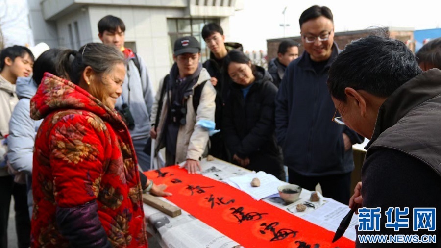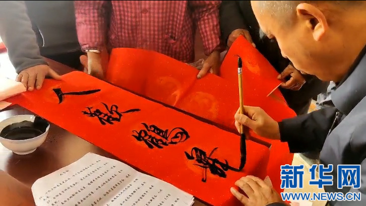 保护区工作人员在湖区为群众写春联。新华网 发 陈荻薇 摄