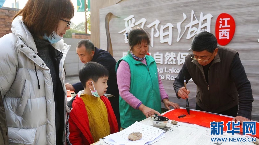 近日,鄱阳湖国家级自然保护区管理局的工作人员在湖区为群众写春联并送上新春祝福。一幅幅带着情谊的春联墨香浓浓、吉祥喜庆,让整个现场充满了年味。