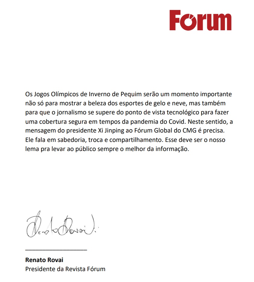 巴西《论坛》杂志是一份创刊超过20年的巴西本土媒体,其受众规模在巴西新闻媒体中名列前茅。《论坛》杂志总裁雷纳托·罗瓦伊先生全程在线参与论坛,仔细聆听习主席贺信及各位嘉宾的发言后,他向总台发来签名贺信。贺信中,罗瓦伊先生盛赞论坛的成功举办和其重大意义。他表示北京冬奥会的举办十分重要,赛事不仅将展示冰雪运动之美,同时新闻媒体也将在新冠疫情期间,在采用高科技手段对赛事进行报道方面有所突破。习近平主席向论坛发来的贺信中提到了智慧、交流和分享,这应该成为我们的座右铭。作为媒体,我们的宗旨就是为读者奉上最优的资讯和信息。