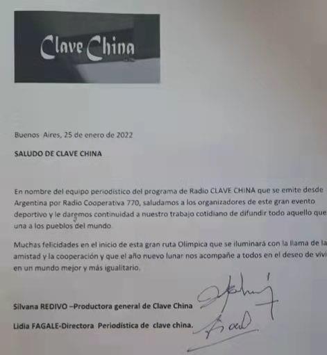 阿根廷合作广播电台王牌栏目《中国密码》总制片人西尔瓦娜·雷迪沃在贺信中感谢总台的邀请,并预祝本届冬奥会取得圆满成功,“愿伟大的奥运被友谊与合作之火照亮,祝福大家春节快乐,希望世界变得更好更平等。”