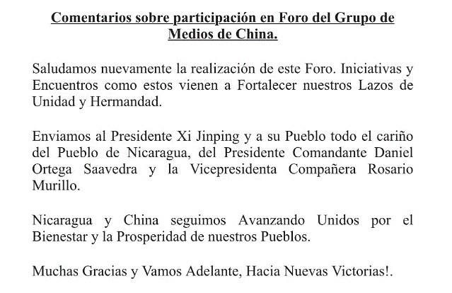 会后,多家参会媒体负责人向总台和论坛发来贺信与祝福。尼加拉瓜通讯与民政委员会的媒体协调人丹尼尔·埃德蒙多·奥尔特加·穆里略,全程在线参与论坛,论坛结束后他接受总台记者采访时对首届全球媒体创新论坛给予高度评价。同时他还向论坛发来贺信,信中写道:我们再次向本次论坛致敬,论坛提出的倡议旨在加强世界各国团结和兄弟情谊的纽带。我向习近平主席和中国人民致以尼加拉瓜人民、总统丹尼尔·奥尔特加和副总统罗萨里奥·穆里略同志的敬意。尼加拉瓜和中国将继续为两国人民的福祉和繁荣携手并进。非常感谢,让我们继续前进,迈向新的胜利!