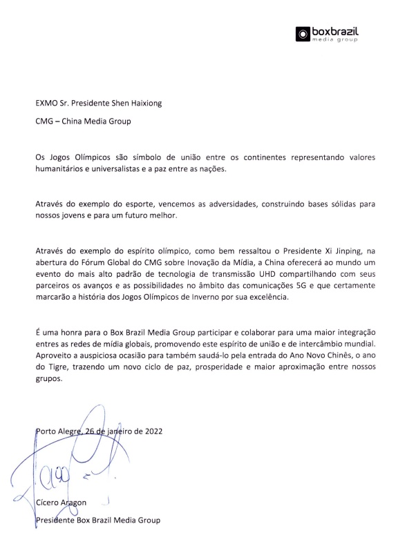 巴西盒子传媒集团是巴西主流影视媒体,受众覆盖约1600万户巴西当地家庭。论坛成功落幕后,巴西盒子传媒集团总裁西塞罗·阿拉贡先生立即通过拉美总站向慎海雄部长发来贺信,祝贺首届全球媒体创新论坛成功举办。阿拉贡先生在信中表示,习近平主席致论坛的贺信内容令人受益匪浅,他相信中国无疑将为世界呈现一场高科技、高水平且精彩绝伦的体育盛事,北京冬奥会和冬残奥会必将永留史册。巴西盒子传媒集团十分荣幸能够与中央广播电视总台保持合作关系,阿拉贡先生也借此机会向慎部长和总台全体人员致以新春祝福,虎年吉祥!