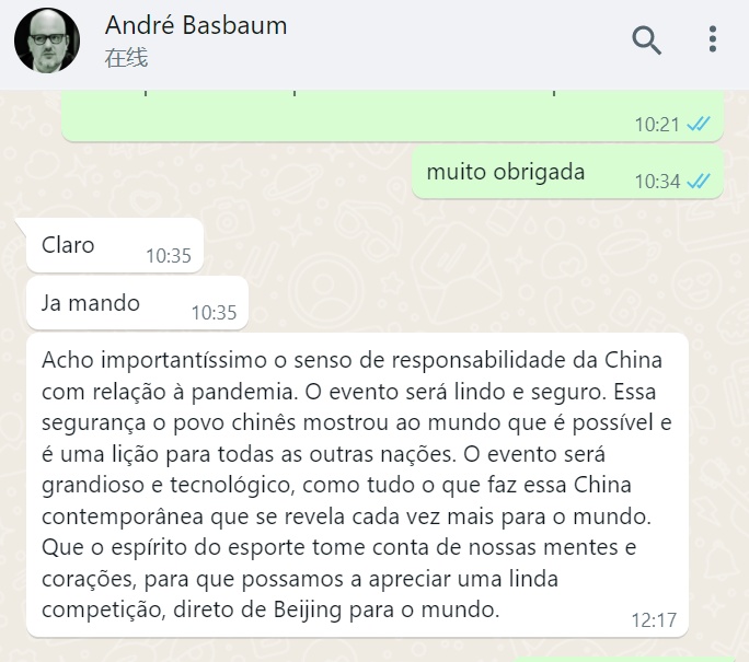 旗手传媒集团是巴西主流综合性商业媒体集团,旗下拥有40余个传媒品牌,覆盖人口超过1.5亿,影响力长期位居巴西和南美洲前列。旗手传媒集团总裁萨阿德先生在论坛举办前向论坛发送了视频祝福。论坛结束后,旗手开路频道新闻编辑部总编安德烈·巴斯鲍姆先生表示强烈赞同习主席所说的“与会嘉宾集智共商、交流分享,助力精彩,展现冰雪运动独特魅力”。巴斯鲍姆先生在给拉美总站发来的信息中表示,他认为中国对安全举办北京冬奥会具有强烈的责任感,相信中国一定可以在安全的前提下成功举办本届冬奥会,这场赛事即宏大又充满科技感,而中国安全办赛的经验将成为全球各国争相学习的楷模。