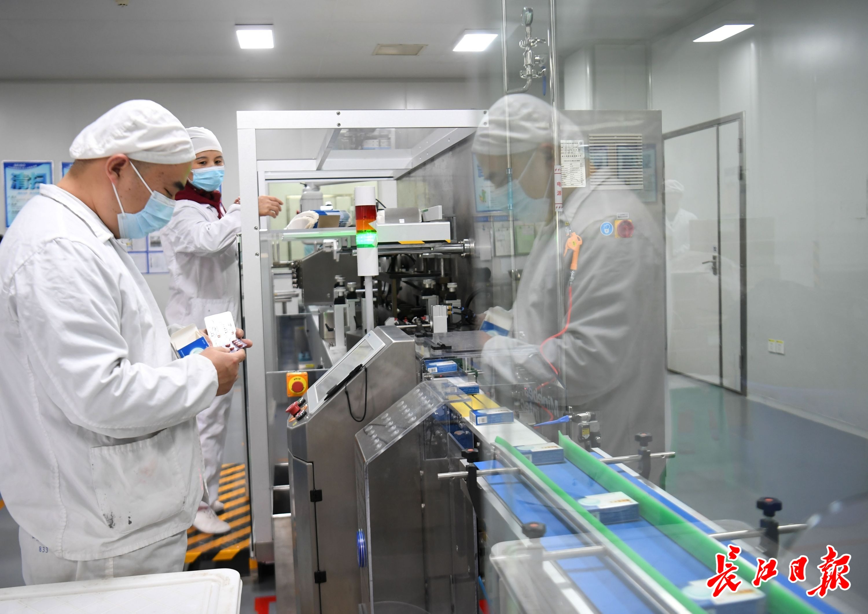 人福药业员工在固体片剂生产线对包装药品进行抽检。长江日报记者高勇 摄