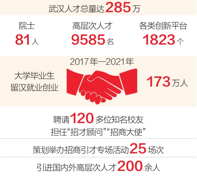 这次会上,武汉提出,将推进人才政策“一网查询”、人才需求“一站受理”、人才服务“一码集成”,营造人才近悦远来的好环境,真正把武汉打造成天下英才的逐梦之城、圆梦之地。