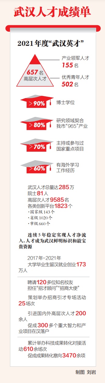 2021年度,657名高层次人才入选“武汉英才”计划,其中,产业领军人才155名,优秀青年人才502名。