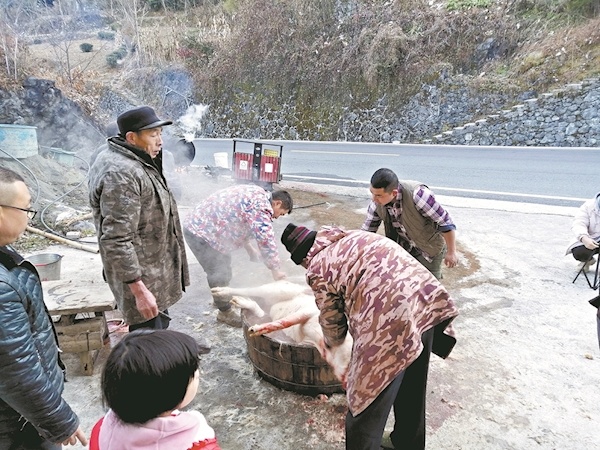 栗子坪的土家人,可能是生活在国道边的缘故,日常生活习俗已与汉族人无异,所以“洗”猪的过程,也没有太多的仪式感和象征性,唯一能展现的是他们今日的富足。