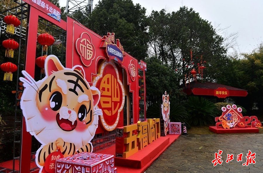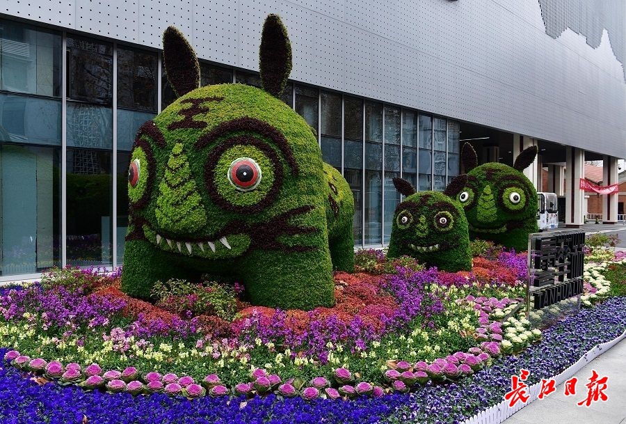 江汉关前的立体花坛为新建,以“‘梅’好武汉 福虎迎新”为主题。记者看到,立体花坛的中间是一个花团锦簇的大花篮,两侧分别是几只喜笑颜开,身着红衣的老虎,老虎的周边簇拥着朵朵红梅,立体花坛里还点缀着花窗、灯笼等传统古典元素,整体十分欢乐祥和。