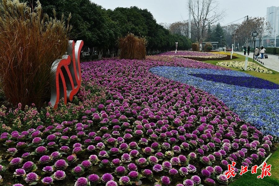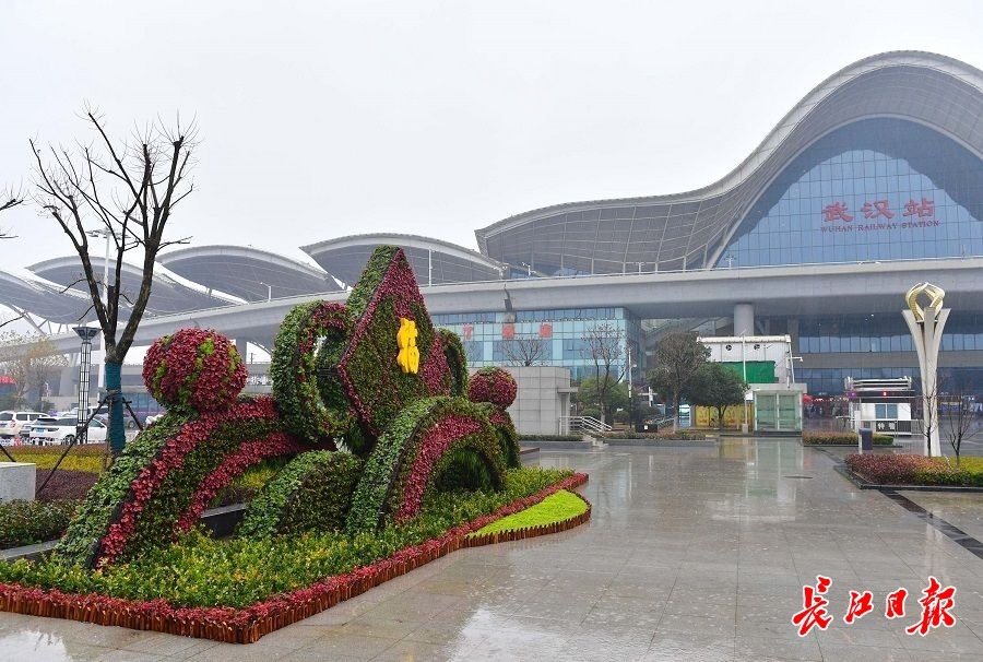 武汉火车站东广场的立体花坛。长江日报记者李永刚 摄