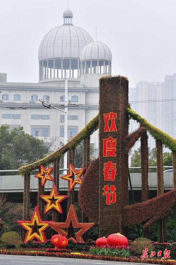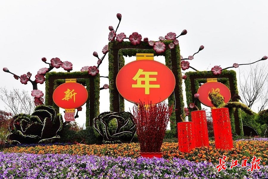 琴台立交桥下“欢度春节”立体花坛。长江日报记者李永刚 摄