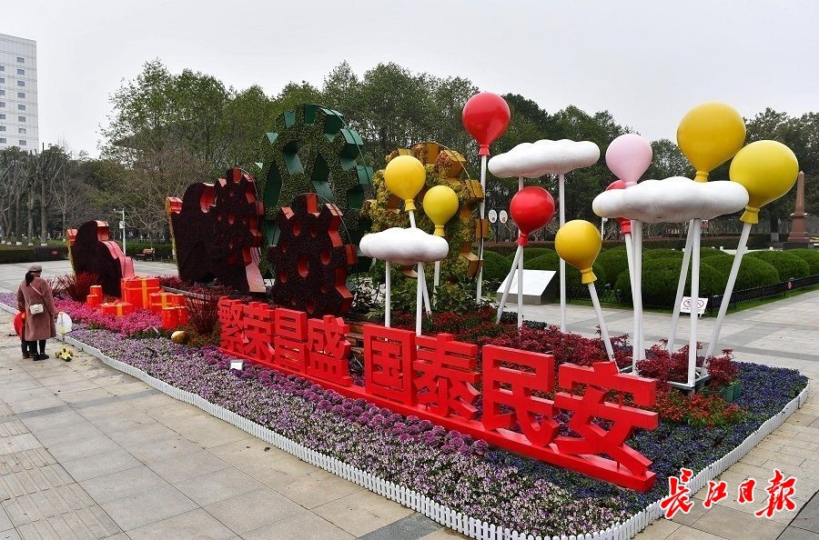 解放公园一号门的立体花坛充满年味。肖茗予 摄